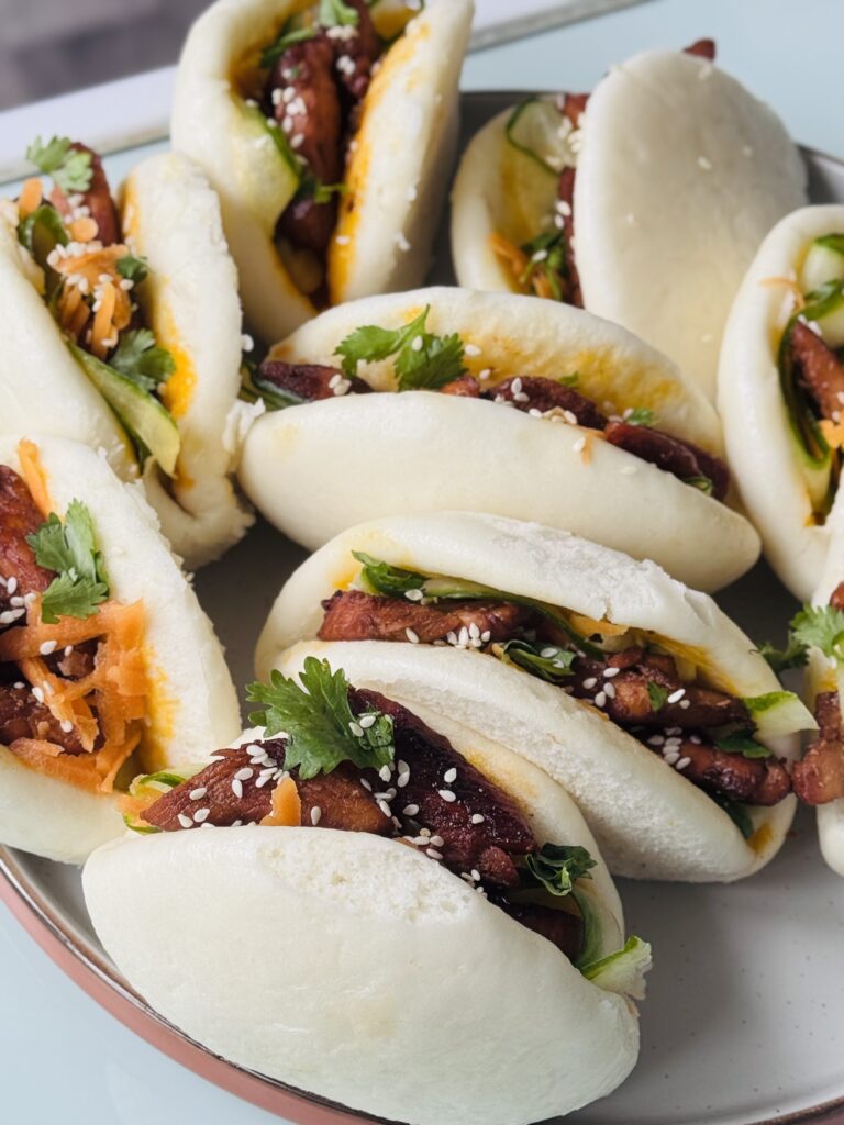 Soft Bao bun, pickled carrots, cucumber, soy marinated chicken, special sauce, coriander.